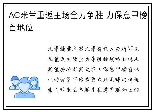 文章摘要:本篇文章将深入分析AC米兰重返主场,全力争胜的战略目标及其重要性,尤其是在力保意甲榜首地位的背景下。作为意大利足球的传统豪门,AC米兰本赛季在意甲赛场上的表现颇为引人注目,重回主场将为球队提供一个重要的机会来巩固和扩大他们的领先优势。文章将从四个方面进行详细阐述:首先是AC米兰当前的整体表现与状态,其次是球队在主场比赛中的历史优势,再到球员阵容的状态与配合,最后探讨主教练对战术安排的深思熟虑。这些因素共同构成了AC米兰全力争胜的重要因素,本文将分析如何确保球队在主场的优势转化为胜利,维持并扩大他们在意甲的领先地位。